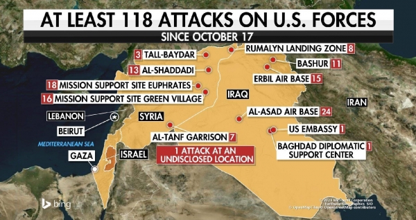 据不完全统计,自加沙开战以来,已经针对美军基地进行了118次连续轰炸。此外,伊拉克伊斯兰抵抗运动还对美军驻叙利亚东南部的坦夫军事基地、绿村以及鲁梅兰基地实施了自杀式无人机打击。为此,美军在2024年1月4日发动了报复空袭。