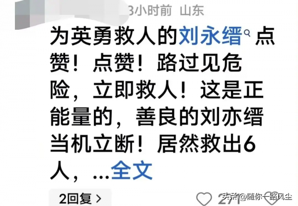 为英勇救人的刘永缙点赞!多亏了他当机立断,成功救出6人,最小的才3岁,幼稚的儿童。这种善举应大力宣传,以正社会风气!