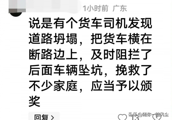 另有网友称∶那个货车司机发现道路坍塌,把货车横在断路边上,及时阻拦了后面车辆坠坑,挽救了不少家庭,应当予以颁奖。