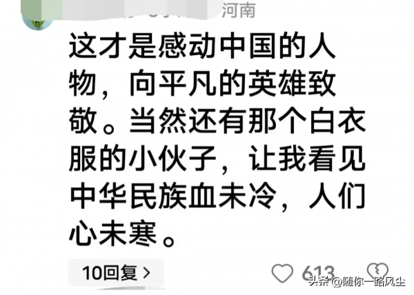 这才是感动中国的人物,向平凡的英雄致敬。当然还有那个白衣服的小伙子,让我们看见了血未冷、心未寒。