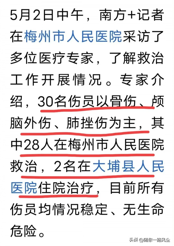 梅州市人民医院专家介绍∶30名伤员以骨伤、颅脑外伤、肺挫伤为主,其中28人在梅州市人民医院救治,2名在大埔县人民医院住院治疗。