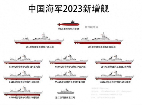对于2023年中国海军新增服役的舰艇,根据公开的资料显示,其中包括两艘先进的055型大型驱逐舰和七艘054AG型护卫舰,还有一艘039C型常规动力潜艇。而在台湾地区,也有一艘轻型沱江级护卫舰加入行列。这些新舰艇虽然各自拥有强大的战斗能力,但由于今年缺乏大型航母、两栖攻击舰和船坞登陆舰这类重量级战舰的加入,总吨位相比往年有所减少。