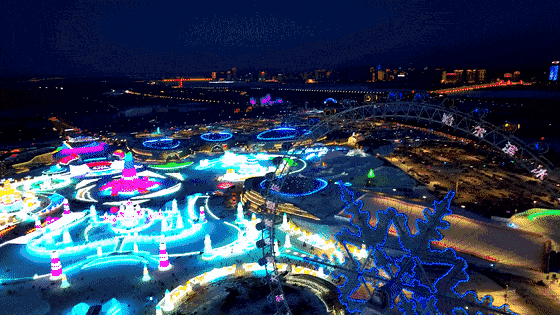 哈尔滨冰雪大世界市场营销部副部长孙泽旻说:"设计了很多中式的桥,古香古色的。在灯光的运用上,今年也是高科技运用最多的一届,主塔实现了全彩可控灯光变换,伴随着音乐的律动而律动,光影互动加入到了雪雕当中。今年我们全新升级打造了预约系统,文创产品数量达到了100种以上,历届最多的一届。"