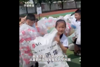 开学这几天,在宁波慈溪市观海卫镇,慈溪市第二实验小学的孩子们或手拎或肩扛,将一袋袋空瓶子有序堆放在校园操场上,等待收运车辆进行回收。