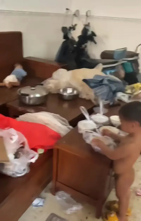 房间里到处乱七八糟的,孩子身上也到处都是屎尿,整个房间还散发着一股酸臭味道。