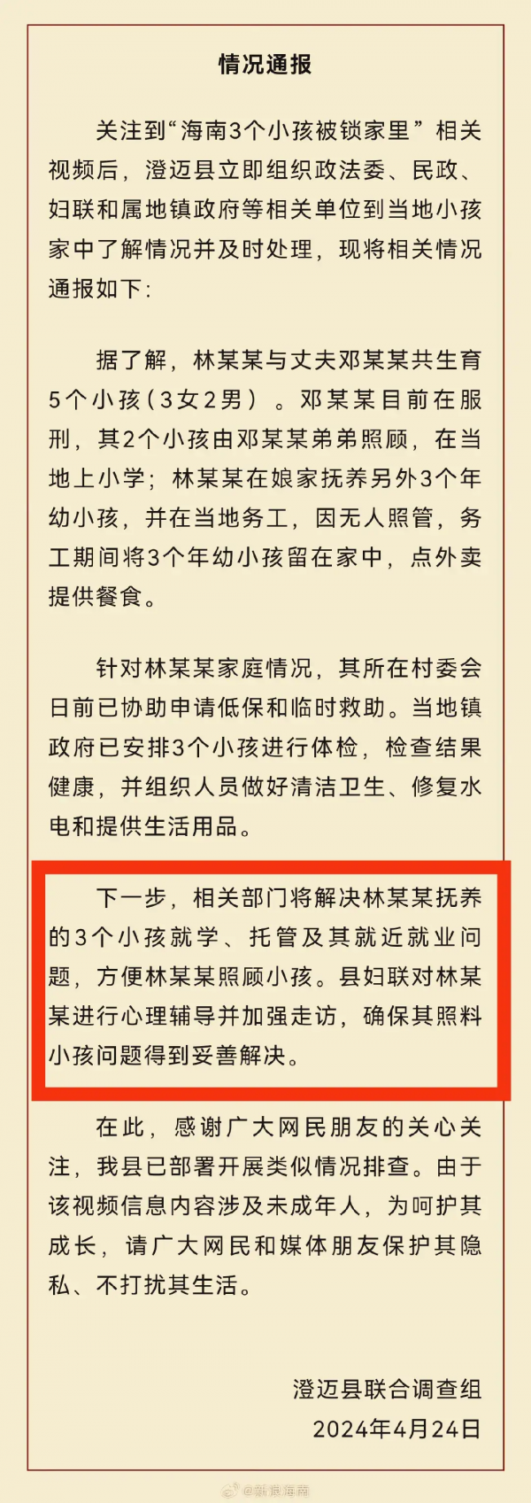 4月24日晚,澄迈县官方行动迅速,及时发布了情况通报: