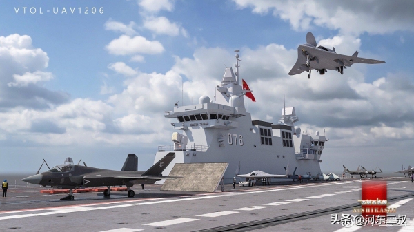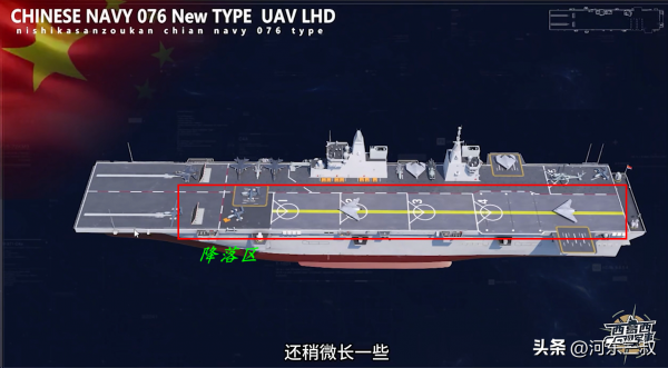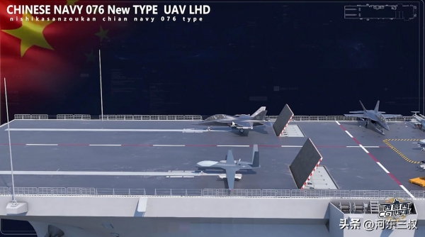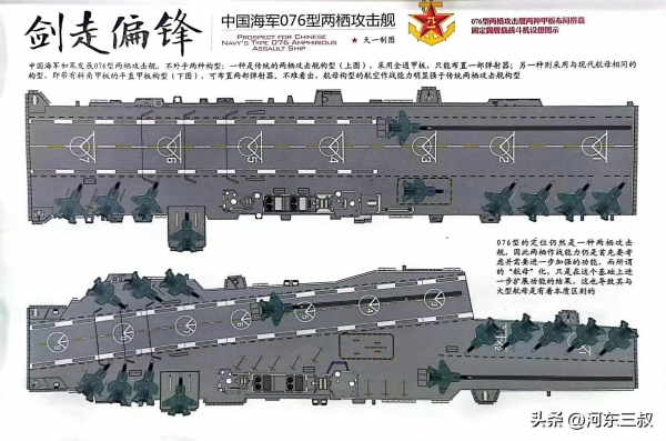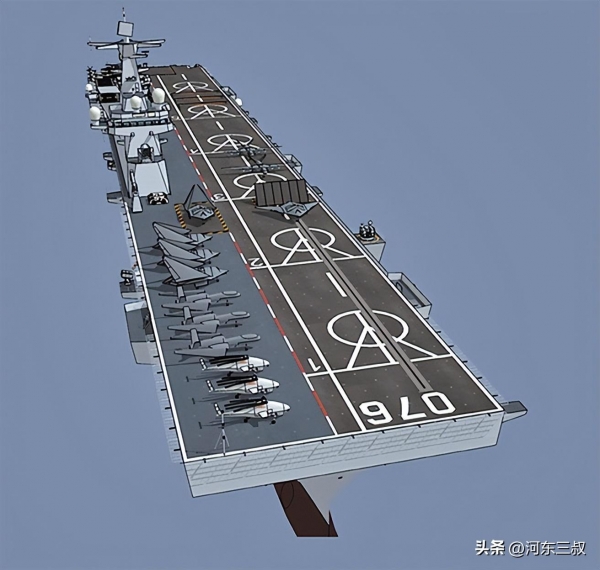 目前对它最大的猜测,就是会不会出现类似航母外飘甲板结构,如果这样设计那么飞行甲板更大,同时也具备大型固定翼战机起降能力。当然另一种设计比较简单,和大平头075型一样方方正正,虽然同样可以部署不少舰载机,但对固定翼飞机来说要求比较高。不过076型显然强化了航空作战能力,比如舰艉中部有一部大型升降机,舰艉左舷也有一部升级机,这一切都表明它准航母的性质。