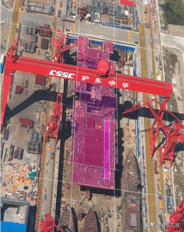 5万吨级排水量疑问比较少,不过甲板如何设计成了关键,很快网络上又出现一张照片。来自国外社交媒体的推测,076型舰长252米,电磁弹射器底槽长度约100米,安装后再加上前部制动段应该就是福建舰同款。如果这是真实可信的,那么076型绝对不是普通两栖攻击舰,完全可以弹射大中型舰载机,已经是一型标准的航母甚至比"闪电航母"还要强。