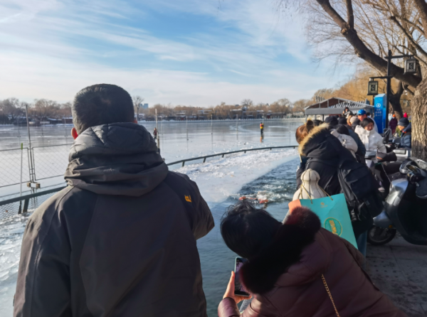 冬泳者的行为,引起了不少围观者的惊呼和拍照。围观者中,有的是来什刹海游玩的市民,有的是来什刹海工作的商户,还有一些是自媒体人,拿着手机开启了直播。他们对冬泳者的行为,有不同的看法。