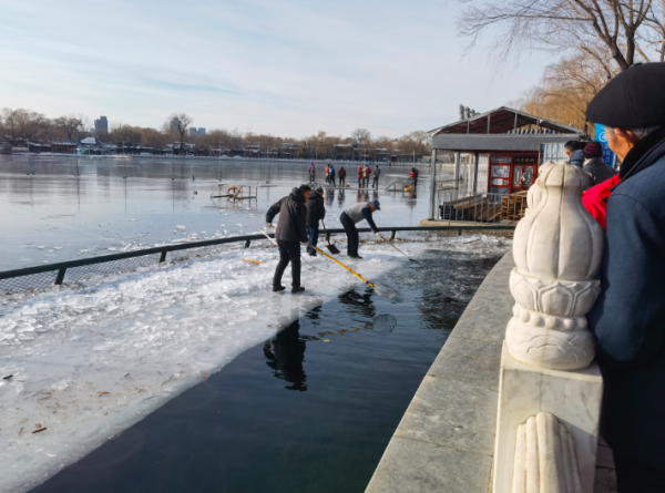 12月22日下午,记者来到什刹海后海北沿,看到一群冬泳者正在冰面上忙碌着。他们用铲子、叉子等工具,将岸边较薄的冰层敲碎,清理出一处宽3米、长约20米的水域。冰面上,还有一些冰场的工作人员在搭建设施,准备迎接即将到来的冰上娱乐项目。