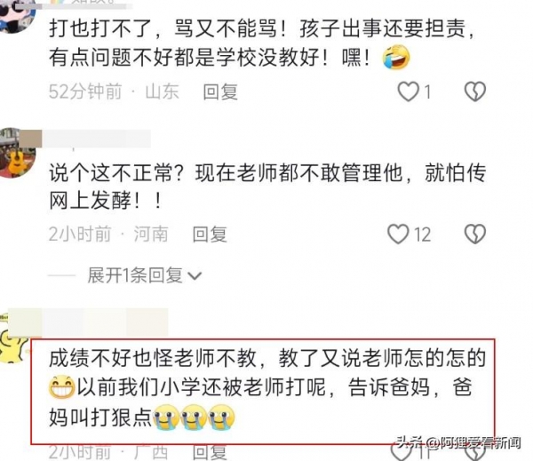 也有网友说:"打也不是,骂又不能骂,小孩出事还要担责,有问题就是老师学校没有教师,成绩不好也怪老师不教,太难了,这老师做的。"