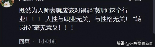 也有网友说:"既然是为人师表就应该对得起教师这个行业,人性与职业无关,与性格无关,转岗毫无意义。"