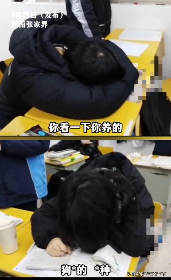 画面一转又对一名女同学说到"你妈是不是喊你到学校躺尸的,是不是"大声质问着。