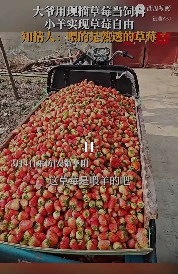一位仁心的大爷看到了这一情况,他毅然决定行动起来。当天,他骑着三轮车,摘了满满一筐熟透的草莓,准备带回家喂养羊群。