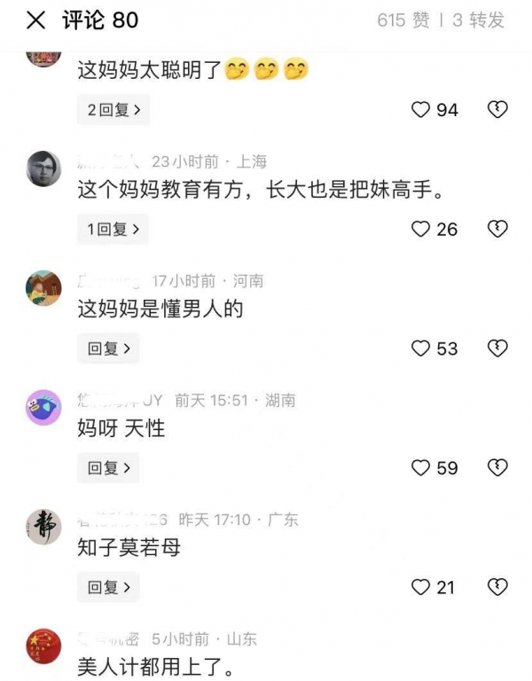 古时候有孙子兵法三十六计,其实用到我们的实际生活中也是实用的。有的网友调侃说,这位妈妈使用的是美人计。
