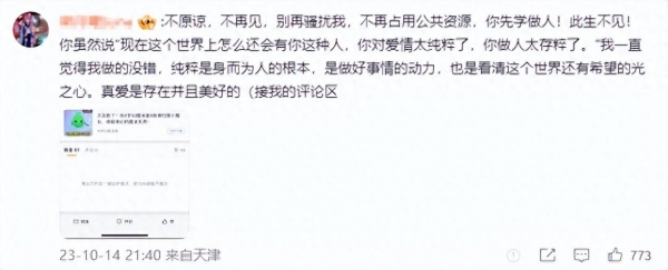 梁某也在其评论区回应称绝不原谅,"不原谅,不再见,别再骚扰我,不再占用公共资源,你先学做人!此生不见! 你虽然说'现在这个世界上怎么还会有你这种人,你对爱情太纯粹了,你做人太纯粹了。'我一直觉得我做的没错,纯粹是身而为人的根本,是做好事情的动力,也是看清这个世界还有希望的光之心。真爱是存在并且美好的。你不屑,是你德不配位。 你心中没信仰也更没有真爱。 记得自己的名字,对得起你两个木字,三个口字的真正解释。不要再祸害好人家的姑娘。"