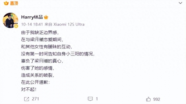 对此,10月14日,林品发文回应女友爆料,称:"由于我缺乏边界感,在与梁某恋爱期间,和其他女性有暧昧的互动,没有第一时间告知自身小三阳的情况,辜负了梁某的真心,伤害了她的感情,造成关系的破裂,在此公开道歉:对不起! "