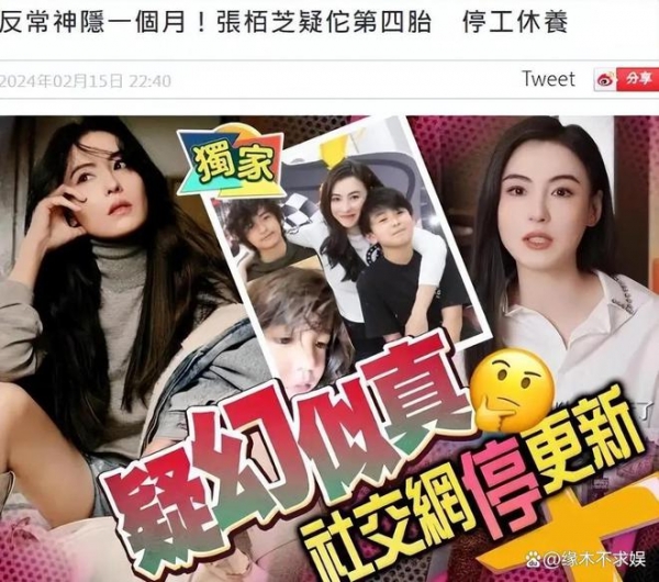 因为久未露面,今年2月份的时候港媒还爆料张柏芝疑似怀了四胎。港媒用硕大的标题写着:神隐一个月,张柏芝疑怀第四胎,停工休养。记者向张柏芝经纪人求证,对方也没有回复。