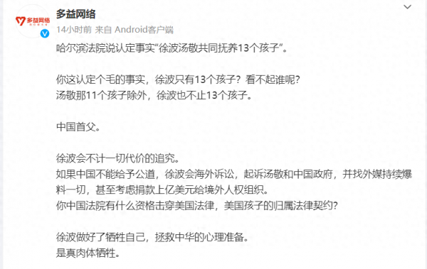 然而徐波这次败诉并且破防的原因就是,这一套在西方国家法律体系内的玩法,在我国并行不通。本次判决的法官通过亲子鉴定的方式及有定向捐赠等实际行为判决这些孩子跟他是有抚养关系的。他的所谓捐精想撇清责任这一招不好使。这也是徐波败诉后受到了刺激,用其公司账号直接在网络上上春秋笔法,辱骂叫嚣我国司法体系,试图用舆论反转判决,让二妞妈将3亿元人民币退回。