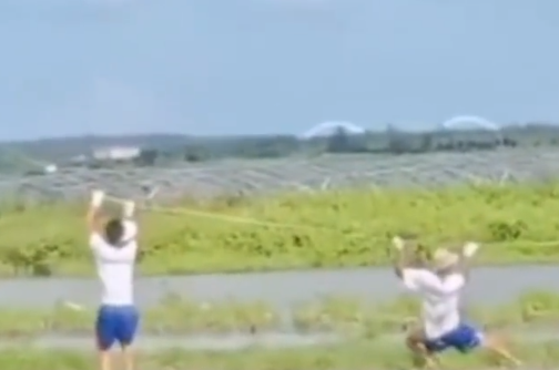6月22日,在海南万宁,几名男子放风一只巨型风筝时发生了一起意外事件。其中一名男子瞬间被风筝线卷走,悬挂在半空中。据知情人士透露,幸好该男子最终平安无事。