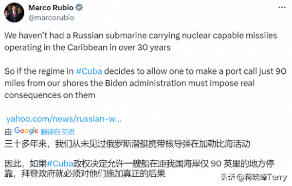 美国共和党鹰派议员卢比奥发文说,俄军潜艇已经有30年没携带核武器在加勒比海域出没,如古巴允许俄核潜艇进入距离美国海岸90英里的地方,拜登政府必须向他们展示"真正后果"。