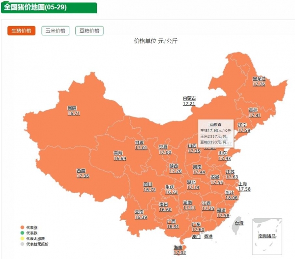 今日湖南更是领涨全国,涨幅达到0.71元/公斤。全国已有辽宁、黑龙江、吉林、北京、天津、陕西、河北、山西、内蒙古、甘肃、宁夏、河南、湖南、湖北、江西、安徽、山东、福建、江苏、上海、广东、海南、西藏等20多个地区猪价涨超17元。其中浙江等个别沿海地区猪价率先涨至18元。