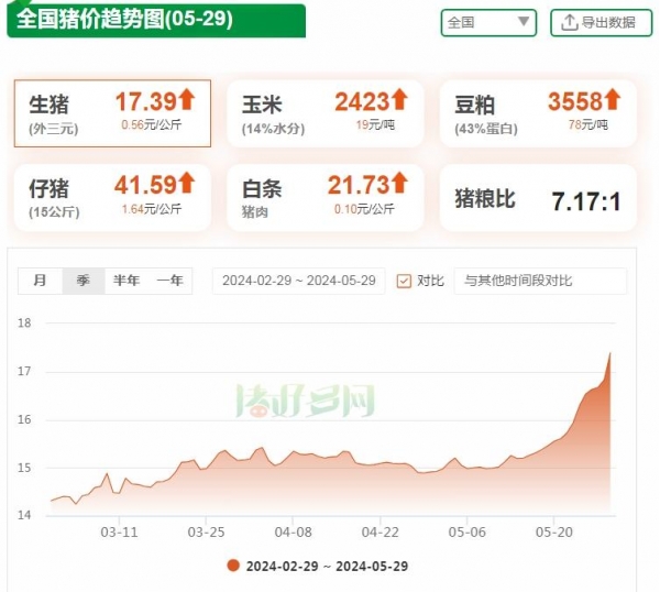 猪好多数据监测显示,5月29日全国外三元生猪均价达17.39元/公斤,均价较昨日上涨0.56元/公斤,猪价自5月中旬开启大涨模式以来,短短不到半个月时间,已经上涨了超2元/公斤,累计涨幅超16%。