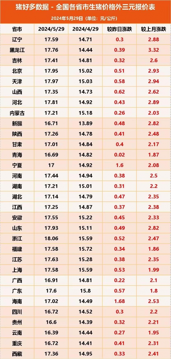 今日全国猪价均呈现"普遍大涨"态势。黑吉辽三省的涨幅均在0.3元以上,华北地区涨势更是凶猛,其中北京、天津、山西、河北单日涨幅均超0.5元/公斤,在此轮上涨中,东北和华北地区的涨幅在全国也是遥遥领先。相比上月。这两个地区涨幅接近3元,目前东北和华北地区的生猪均价都已经超过17元/公斤,逼近18元。