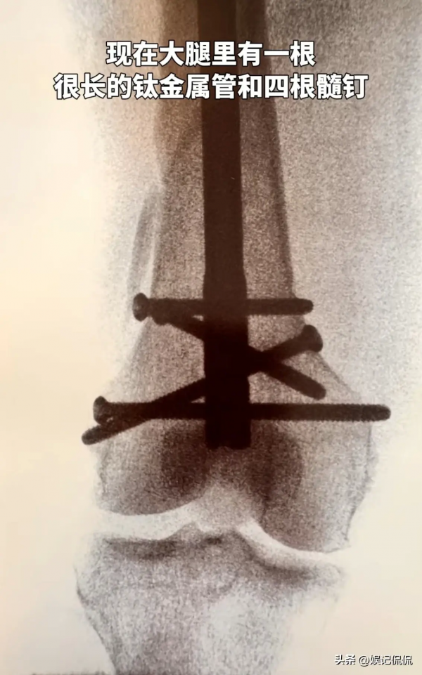 目前,向太已经通过微创手术完成了治疗,只是因为大腿骨断裂严重,因此只能植入一根钛金属管和4根髓钉固定。