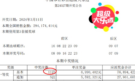 一等奖11注,每注基本奖金699万余元;其中追加一等奖5注,追加每注总奖金1258万元。