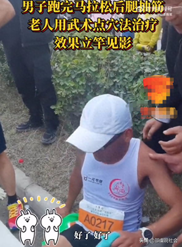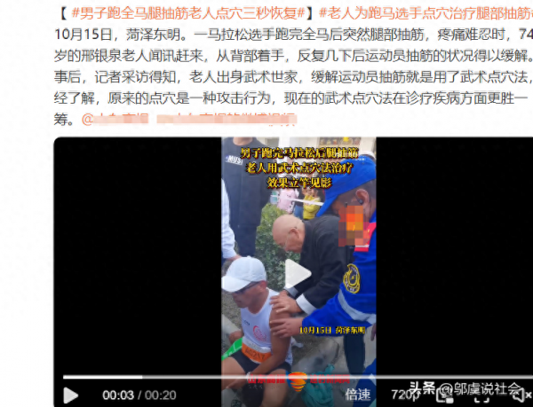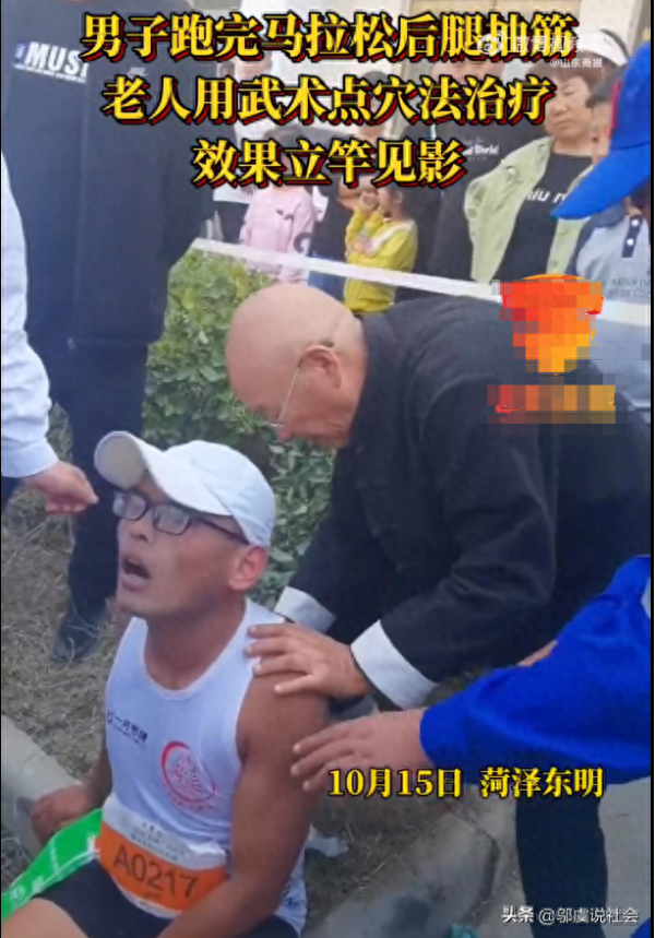 10月15日,菏泽东明的一次马拉松比赛上,一位男子在完成全马比赛后突然腿抽筋,痛苦难忍。幸运的是,74岁的邢银泉老人闻讯赶来,他从背部着手,反复几下后,运动员的抽筋状况得以迅速缓解。