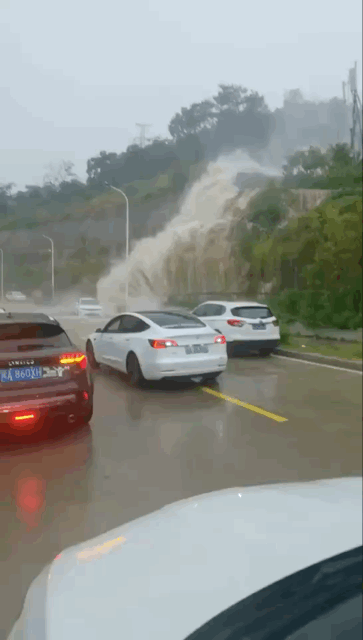 大水倾泻而下,吓退附近的小车