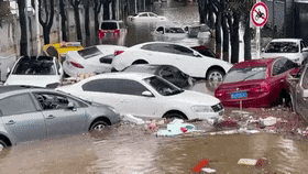 造成道路上停放的多部车辆受灾