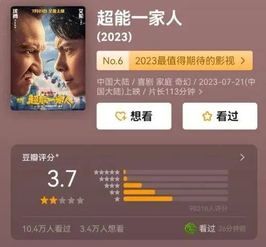 这些粗制滥造、笑点刻意的电影一再拉低了沈腾的口碑。这种情况在今年上映的《超能一家人》达到极致,该片上映两天就拿下1.68亿票房,但豆瓣评分3.7,留言区大量的"烂片"差评。面对俗套尴尬的剧情,沈腾出马,观众也笑不出来了。