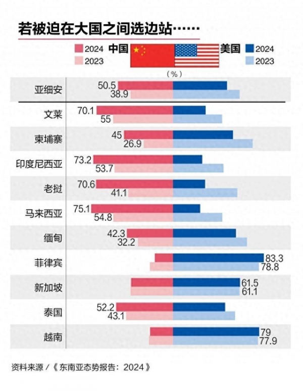 最近新加坡智库"尤索夫伊萨东南亚研究院东盟研究中心"发布了一份《东南亚态势报告:2024》,显示如果在中美之间选边站,东盟十国受访者站中国一边的人数首次超过了美国。这也是自2020年的民意调查增设了这道问题以来,中国首次超越美国成为东南亚民众的首选。具体来说,选择中国的占50.5%(去年是38.9%),选择美国的占49.5%(去年是61.1%)。虽然看起来选择两边的比例差不多,但是去年选择美国的占几乎三分之二,中国已经在一年之内取得了重大胜利。