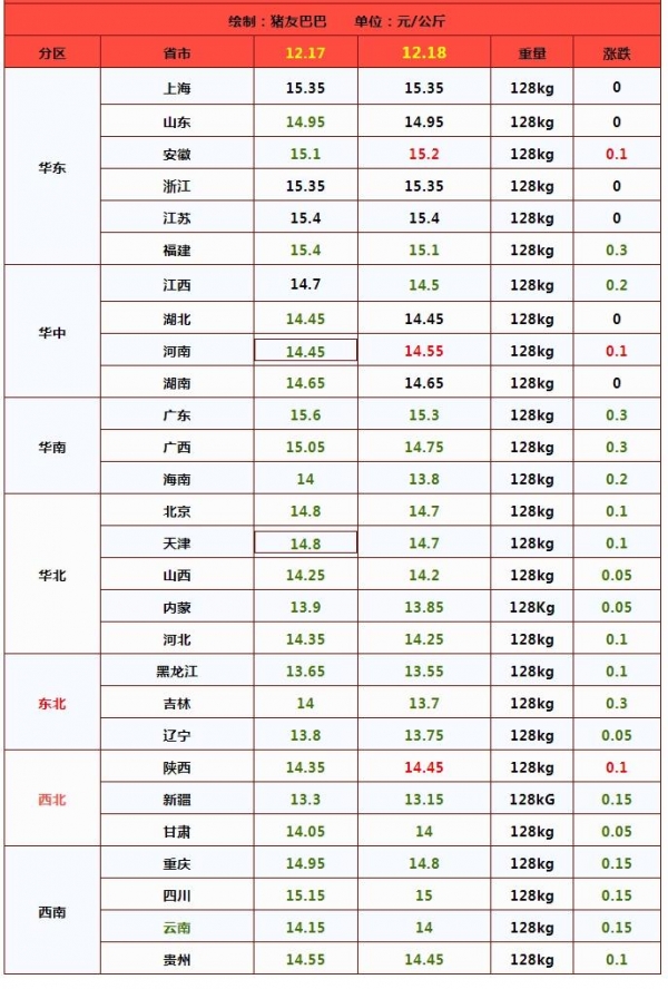 由此分析,12月18日,猪价呈现涨跌互现的走势,下跌范围略显偏多,不过,猪价调整幅度普遍仅有0.1~0.2元/公斤左右,市场下跌支撑偏弱!