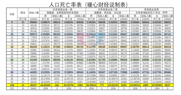 但是我们要考虑到,参加养老保险的往往都是成年人,而且年纪越大,参保越积极。另外,参加了养老保险以后,很多人会对自己的付出有一种执念,他们的预期寿命会更长,死亡率会更低。根据中国保险业的经验生命表就可以看到有关明显的差别。参加非养老保险业务一类的人群,男性40岁死亡率为0.1651%。参加养老类业务的人群,男性40岁死亡率只有0.0878%。