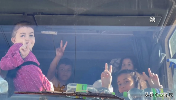 坐在车上的小孩子还不太懂战争意味着什么,看到有人拍摄,他们脸上露出笑容向镜头比了个耶。