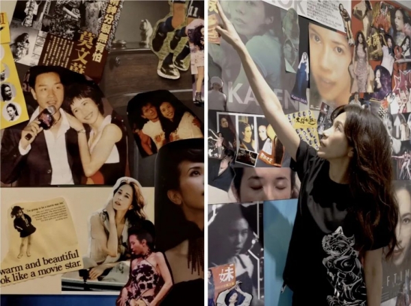 画廊很袖珍,不到40平米,展览的信息量却很大。进门左手边是一整面贴纸墙:和好友张国荣、刘德华、周星驰的合照,《堕落天使》《大话西游》的剧照,还有和知名摄影师夏永康合作的众多创作等等。莫文蔚的20岁到50岁,就都在这里了。