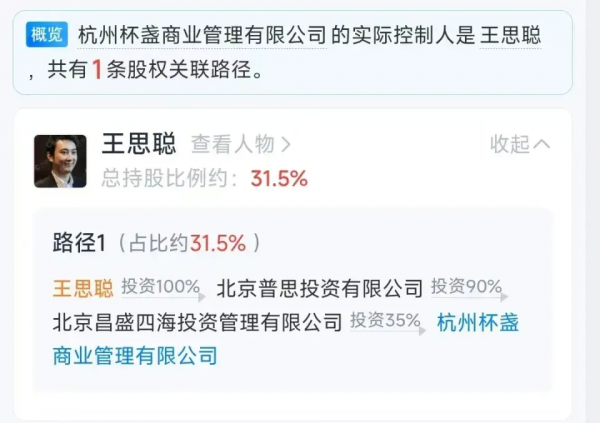 在仪式上,泰安市城市发展投资有限公司与北京寰聚商业管理有限公司共同签署了一份合作协议。根据天眼查APP的资料,北京寰聚商业管理有限公司(简称北京寰聚)是一家主要从事商务服务的企业,于2023年7月20日成立,并拥有1000万人民币的注册资本。公司的董事长是王思聪,总裁为李欣,执行总裁为丁一。深入查看其股权结构,我们发现北京寰聚由杭州杯盏商业管理有限公司(简称杭州杯盏)和九桓置业发展(北京)有限公司共同持股,持股比例分别为51%和49%。值得注意的是,王思聪是杭州杯盏的实际控制人,总持股比例为31.5%。