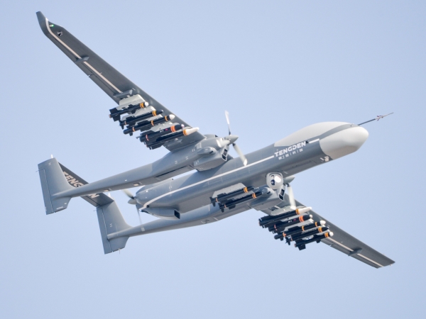 双尾蝎刚出世时,很多朋友都惊奇于这种飞机的造型,上单翼、双尾撑、双发翼吊布局,是四川腾盾科创自主研发的一款大型、模块化、多用途、中空长航时固定翼无人机,其外形有点像二战名机P-38黑寡妇,不过与黑寡妇有点不一样的是双尾蝎还有一个版本是中间机体的尾部还有第三台发动机,这台发动机的存在,使得双尾蝎的载荷能力也得到了大幅提升。