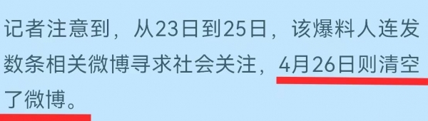 而在4月23日韩女士的公公在微博上曝光自己儿媳与宋处长事件后,全网迅速发酵,这位公公更是连发了多条微博。但是在4月26日,爆料人又清空了所有微博。