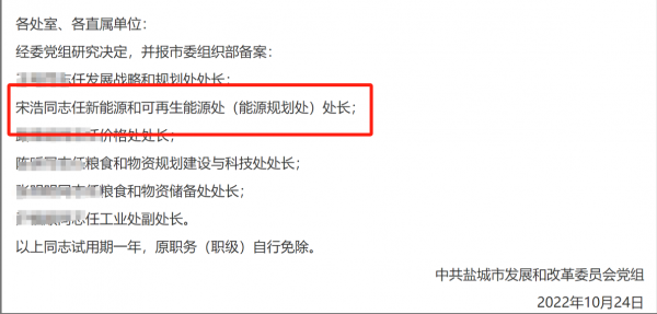 而到了2022年10月24日,便由副处长晋升为新能源和可再生能源处处长,正式成为正科级干部,仅仅用了2年时间由副科晋升正科,这速度犹如坐火箭一般。