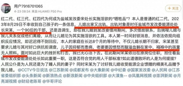 4月23日,公公在微博上愤怒的控诉,本人是普通的红二代,而自家儿媳成为盐城发改委宋处长淫欲的牺牲品,家庭因此遭受巨大的挫折和打击,自己无心活下去,在长达8个月举报过程中,而宋处长却仍在原岗位任职。