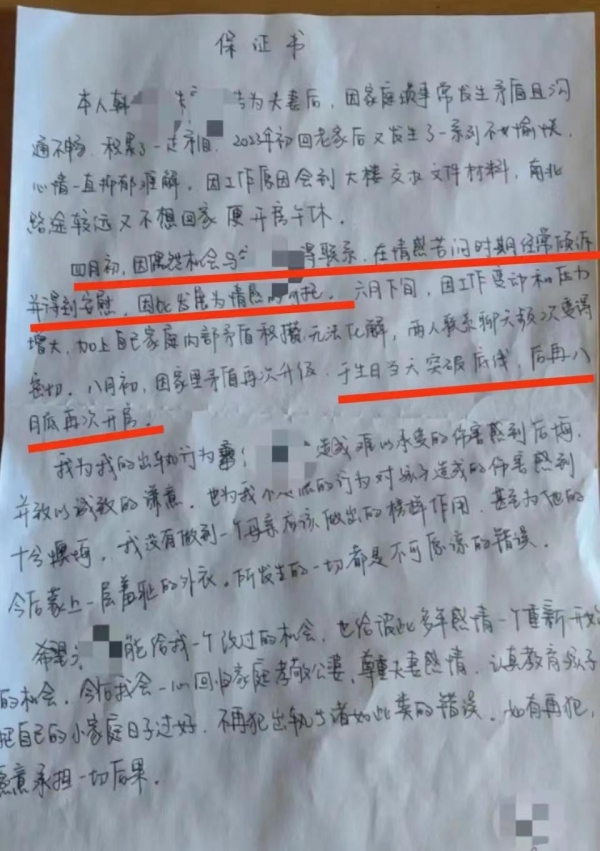 天下没有不透风的墙,虽然两人在单位隐瞒的很好无人察觉,然而被老公发现了,夫妻俩大吵一架。而韩女士(保证书得知女方姓韩)更是写下了保证书,看在多年感情的份儿上,给一个重新开始的机会,认真教育孩子好好过日子,不再犯出轨的错误。