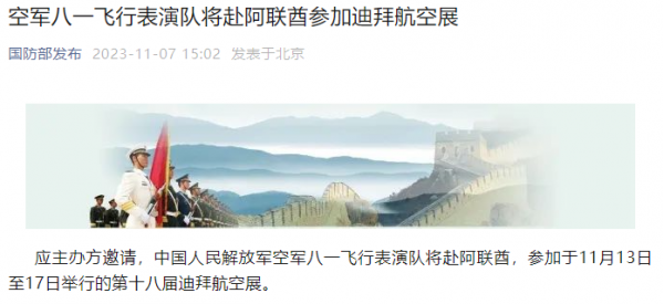 空军八一飞行表演队将赴阿联酋参加迪拜航空展 2023-11-07 15:59 观察者网 据微信公众号"国防部发布"11月7日消息,应主办方邀请,中国人民解放军空军八一飞行表演队将赴阿联酋,参加于11月13日至17日举行的第十八届迪拜航空展。
