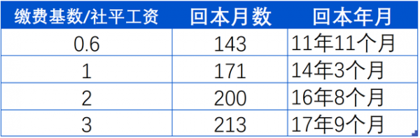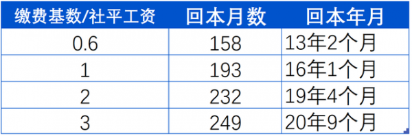 基于这个思路,只要缴费基数/社平工资比值不变,缴费年限的变化并不会影响回本年限。笔者整理计算结果如下表: