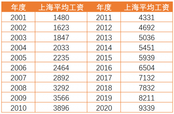 理论上每年的社会平均工资金额并不相同,但在一定程度上代表了相同的购买力。如2001年上海社平工资为1480元,2020年增长到了9339元,虽然相差6倍有余,但可以认为两者的货币价值是相同的。
