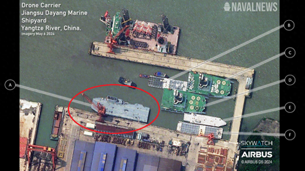 福建舰才回到自己的母港几天,中国造船厂里的一艘小型国产航母又被西方给发现了,他们声称这是一艘无人机航母,从照片上的外形看起来跟航母很相似,也采用的是平直甲板,还有舰岛这些特征,但是这艘舰船跟周边的船舶相比较看的话,显得尺寸有点小,预测吨位应该在1万吨这样,比现在的主流航母会小很多。