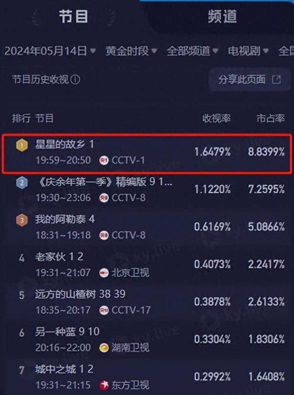 5月14日,《星星的故乡》在中央一套火爆开播,仅一集便斩获全国收视冠军,并且断崖式领先第二第三名。